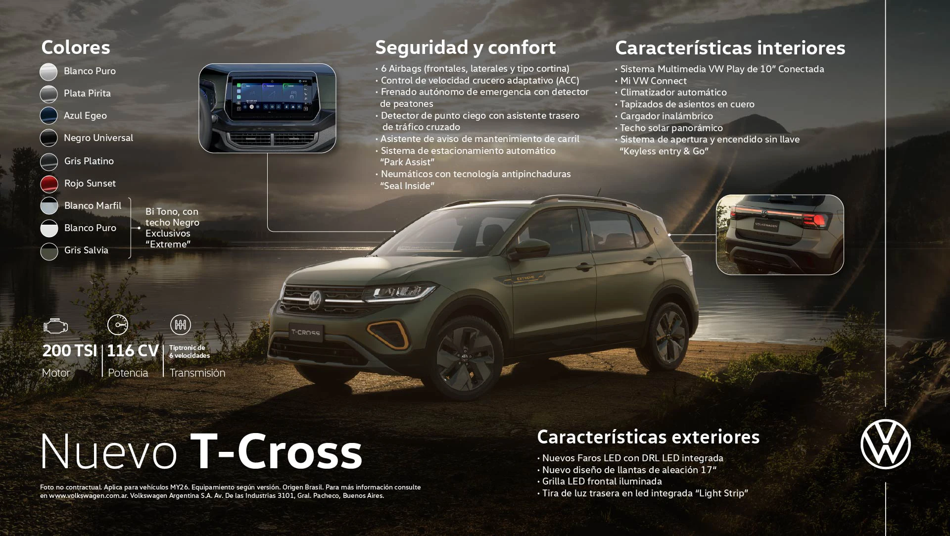 Las versiones del T-Cross Comfortline, Highline y Extreme poseen un motor 200 TSI de 116 CV, que genera menor consumo de combustible y eleva la performance del vehículo aportando una sensación deportiva al manejo. Además, posee una transmisión automática Tiptronic de seis velocidades, proporcionando adaptabilidad, eficiencia y versatilidad para una experiencia de conducción excepcional.